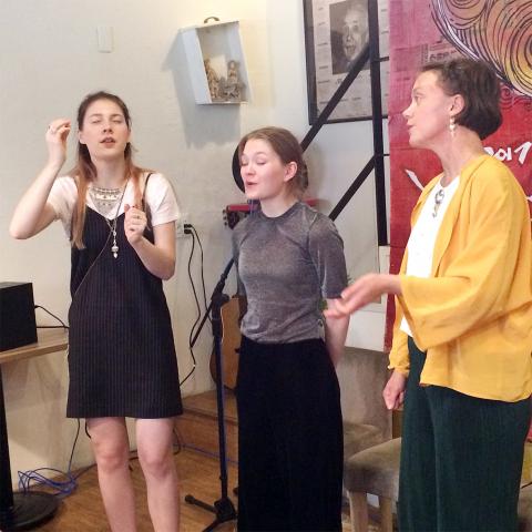 The Norwegian and Swedish trio of Golbma Jiena sing traditional pieces in the Sami language in three-part harmony, playing with glottal stops and contorting their bodies to produce other-worldly sounds.