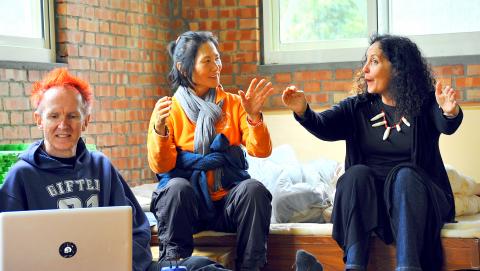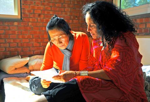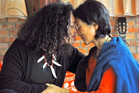 Inka Mbing pauses her soft humming and asks Moana Maniapoto to join in the singing.