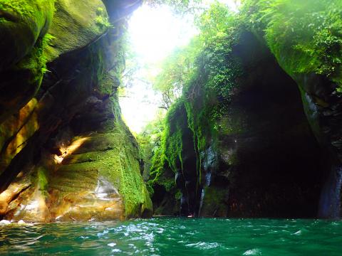 Assuming the stream is fairly low, climb carefully down the slippery rockface above the water’s edge using the fixed rope, and cross the stream to the rocks on the other side. Follow the far bank down a few meters, then either re-cross the stream to the near bank and another patch of rocks at the eastern entrance to the Wormhole, or get straight into the water and swim under the bridge and into it.