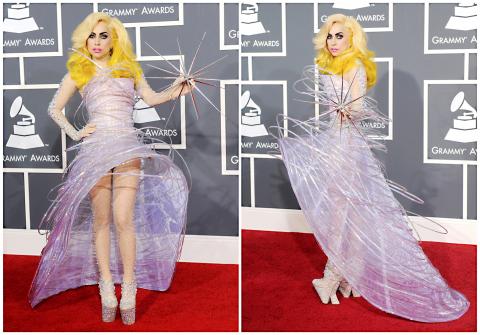 It was at the 52nd Grammys in 2010 that Gaga went Jetsons, hitting the red carpet in a sparkly futuristic lavender dress by Armani Prive with suspended metal hoops encasing her body. She held a huge spiky star for photos. Her wig hair was a bright yellow ombre that appeared attached to the top of the corset-style dress. And Gaga had on those towering high platform shoes she was so fond of.