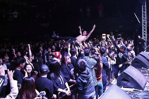 Screaming Chinese-poetry inspired lyrics like a demon bursting from the depths of hell, the black-clad singer raises a white chalice above his bamboo hat as fog enveloped the stage.