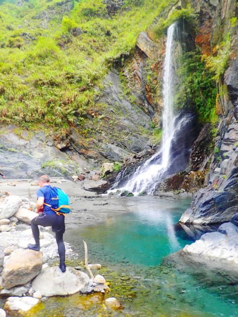 Now simply continue wading and clambering upstream, past a structure resembling an ornate temple built into the sheer cliff. It’s the entrance to the former power plant; the rest of the structure was destroyed during the 921 earthquake.