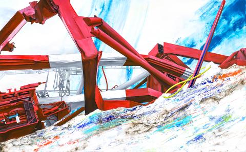 Liang Gallery is currently showing Action Through Inaction, a solo exhibition by Taiwanese artist Chou Tai-chun (周代焌). Chou creates paintings and installations that often allude to science fiction themes intermixed with references to the physical world we live in. In this exhibition, the artist continues to explore the relationship between humans and the environment through a series of paintings that “visualize the painter’s take on the external world and how he reflects upon his position in it,” the gallery writes in a press release. In this exhibition, Chou presents scenes of disasters with a mixture of photorealistic objects and abstract planes of lusciously colored textures. For some of his works, he draws inspiration from his experience as artist in residence in South Korea and Japan in the past two years. Although the gallery specifically mentions his visits to Fukushima in a press release, it does not point out which paintings draw direct inspiration from the area. Beyond the Mountains — 30 Degree Waves depicts a fallen, red industrial machine awkwardly laying on its side on an abstract color field. Beyond the Mountains — Reality is the Best Teacher is a painted assemblage of hills painted with green and acidic yellow strokes, accompanied by a pool filled with blue liquid ready to spill over.