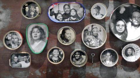 The main showpiece, Dinding Potret Kanta (2014-2017, translated as “Kanta Wall Portraits”), is a collection of portraits of Malaysians. Hand-printed on silver resin-coated paper, the portraits are framed in aluminum and steel food cans and bottle caps, and mounted on a 1.9m by 0.5m oxidized zinc panel.