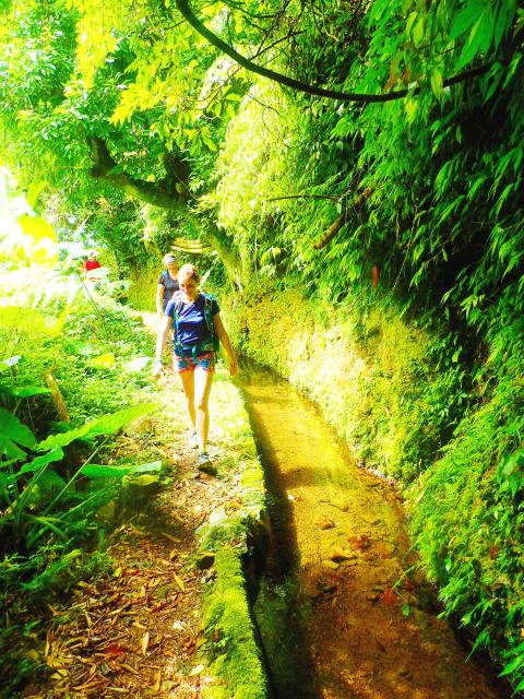 Keep left at the next junction, down steps, and recross the stream by another footbridge. Now follow the steps up the hillside opposite, crossing the first of three water channels which contour the wooded hillside, carrying water down to the farms of Pingdengli. The oldest is the uppermost, the three-kilometer-long Pingdengli Old Water Channel (平等里古圳) which was established in the 1830s. Turn right onto a dirt path beside this third water channel, and pass through an iron gate.