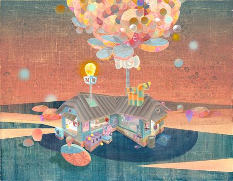 Huang Po-hsun (黃柏勳) is a Taiwanese artist whose paintings are characterized by decorative forms, imaginative narratives and a pictorial flatness. Art writer Chen Kuang-yi (陳貺怡) ascribes influences of Japanese otaku culture to his distinct aesthetics, although Huang has not explicitly spoken of such references. According to Chen, Huang began his artistic career in a time when Taiwanese popular culture was influenced by comics, anime, toys, video games and movies. “The pink, sweet, fluorescent colors and the special shapes in his paintings are like the [special qualities] presented in anime, comic [and video] games,” writes Chen in a preface to Huang’s solo exhibition, Silent Dateline, presented at Gaiart. The show features a selection of new works on canvas that reveal Huang’s endeavors for a heightened sense of decoration. His new paintings draw elements from the 18th century Japanese painting and print style Ukiyo-e, patterns from Japanese craft paper, as well as organic form from natural life. Silent Dateline depicts an abstract landscape of geometrical shapes against a background of clouds and a dark, ultramarine sea. Shining Days, meanwhile, features two toy-like stores overcast by a cluster of pink diamond shapes.