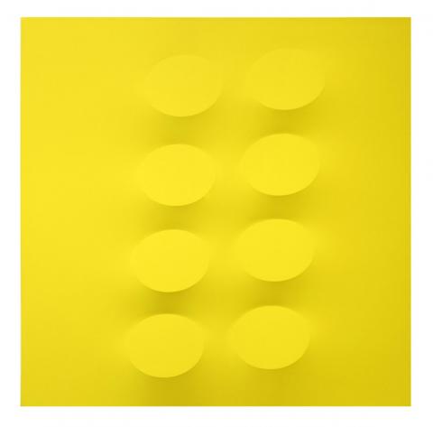 There are only two days left for In the Matter of Color, a group exhibition by four Italian painters who have been active since the 1950s. The gallery ties the four disparate practices together by a central theme of color, describing their use of chromatics as “an identity and primary element” that has been cultivated throughout their careers. Color, according to curator Matteo Galbiati, is a tool of resistance that the artists use to “launch [themselves] into an autonomous independence [from academicism].” Through color analysis, interpretation and translation, the four artists present recent works that continue their pursuit of contemporaneity. Natale Addamiano’s I Cieli stellati, literally translated as “the starry skies,” is a series of abstract paintings of misty, layered atmospheres that resonate with a traditional sense of romanticism. Alberto Biasi’s Agli estremi depicts an interplay of three rectangular forms that continue the artist’s engagement with Programmed Art, an Italian art movement sparked by interests in technology and art. Turi Simeti’s oval paintings create distinct optical effects by manipulating the physicality of the painting surface. Pino Pinelli’s Pittura G is a yellow monochromatic painting that explores the tactility and form of color.