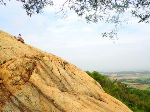 After the lake one of several curious and rather impressive balancing boulders stands beside the road, at the brink of a rocky precipice. A couple of meters further, fork right onto the short but scenic Sunrise Viewing Trail (觀日步道), cut into the impressive, bare granite face of the hill. Near the end it passes beneath another huge boulder, which looks as though it might roll down the mountainside at any moment.