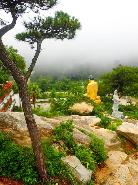 Walk back downhill along the road, and in a minute or two there’s the Buddhist Haiyin Temple (海印寺). It seems to have had a facelift recently, and is now a very handsome sight, surrounded by neatly manicured grounds and spiritual statues artfully dotted among the rock outcrops. There are toilets nearby, and a useful water fountain for topping up your water bottle.