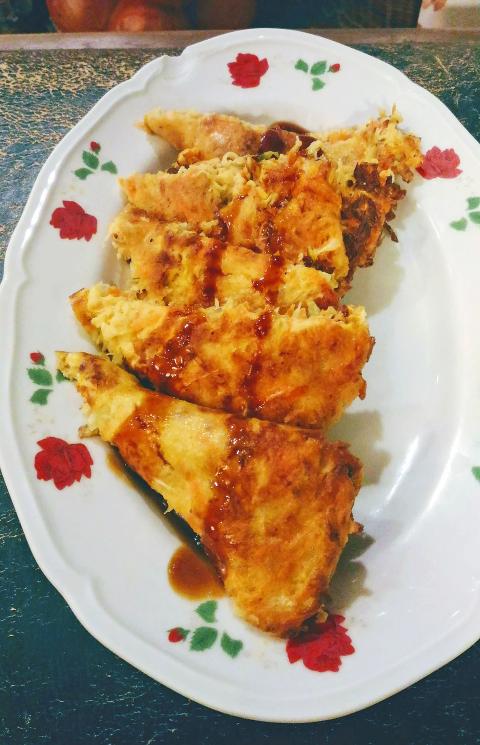 6. Heat a non-stick skillet and add 1 tbsp of oil. Put in about half the mixture and spread evenly. Cook over medium heat until the pancake becomes firm and golden brown, about 2 minutes. Flip over and cook for another 2 minutes.