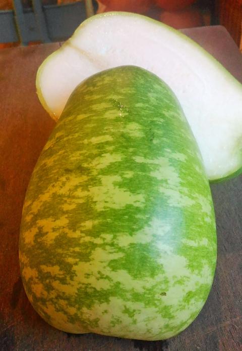 You are more likely to find bottle gourds in elongated shapes, rather like a thick Lebanese aubergine, or a pear-like shape rather like that of a pomelo. The flesh is a dense white with seeds barely visible in a slightly spongy center. For its stir fry preparation it is generally roughly julienned. The firm mottled green skin can be shaved off easily with a knife and there is no need to remove the seeds, as the whole mass of white flesh is edible.