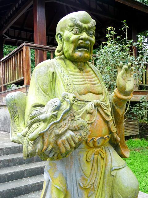 In addition to the facilities at Purple Cloud Temple, there’s a bathroom beside Arhats Plaza (羅漢廣場), where human-sized bronze statues of all 18 “guardians of the Buddhist faith” look out across the valley. Most of them look quite serene, and all appear very well-fed. Nantimitolo (慶友尊者), however, wears an expression like that of a PTSD sufferer. His terrified grimace made sense when I found out he’s also known as the Taming Dragon Arhat (降龍羅漢).