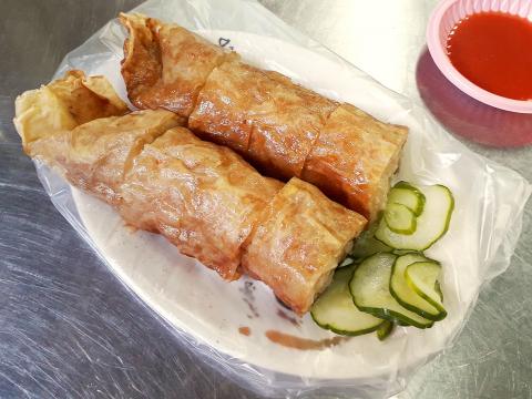 In front of the temple several vendors sell traditional hot foods. I ordered a portion of jijuan (雞捲), known to Taiwanese-speakers as toikng (多餘捲, “leftovers [turned into] rolls”). It consists of pork and other ingredients, deep-fried in a tofu-skin wrapping, then served with a mildly sweet-spicy dip. After a morning immersed in the Taiwan of yore, it seemed appropriately old-school.