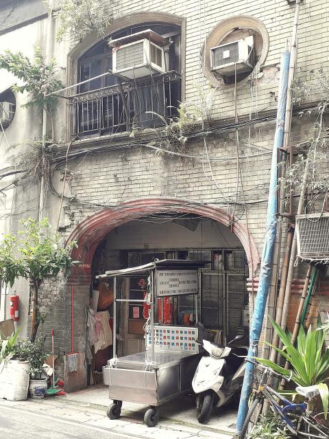 Because the Tamsui River flooded from time to time, the ground floor of the shophouses and some newer buildings nearby is substantially above street level. The corner part of the shophouse block has been renovated and (judging by the sign outside) turned into a venue for cultural-creative industry startups. The remainder, unfortunately, is falling into ruin.