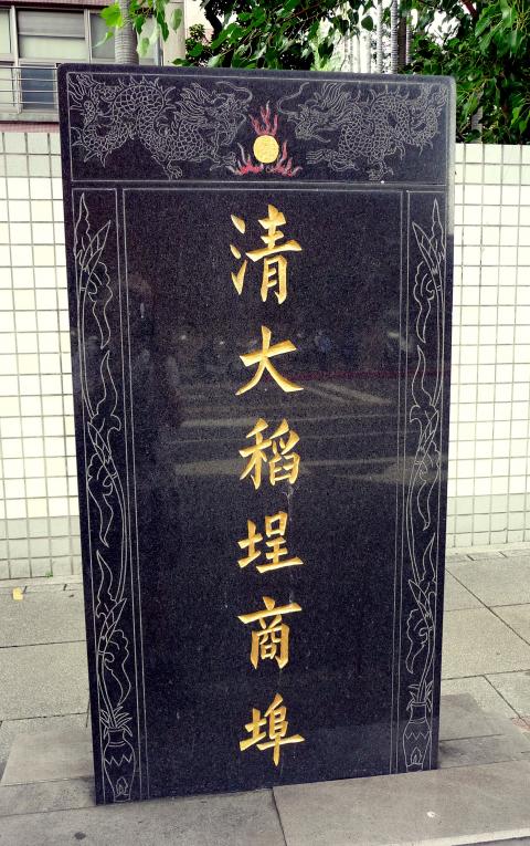 My zigzag route started at the southern end of Xining North Road (西寧北路), where the Dadaocheng Pioneering Monument (大稻埕開埠紀念碑) stands on the sidewalk just outside Municipal Zhongxiao Junior High School (市立忠孝國中). Erected in 1985, this handsome black slab bears, on the side facing the traffic, the characters Qing Dadaocheng Shang Bu (清大稻埕商埠, “[Site of] the Qing-era Dadaocheng Commercial Port”).