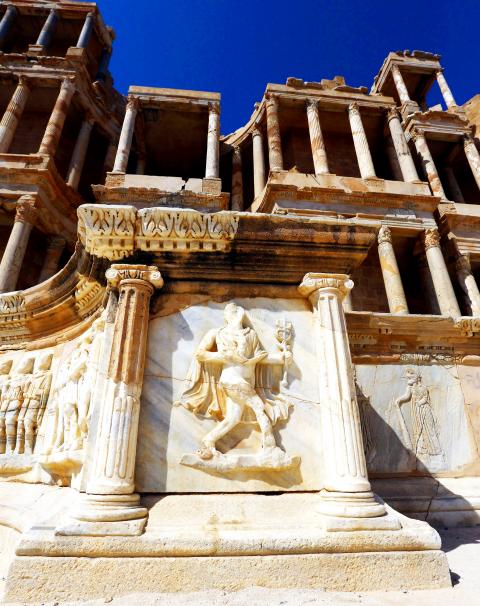 Perched on the edge of Libya’s Mediterranean coast, the ancient city of Sabratha remains an awe-inspiring spectacle, the pink columns of its amphitheater towering above turquoise waters.