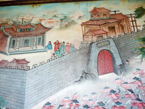 In the chamber behind, you can see spirit images of Mazu (in the center) and Cheng Huang Ye’s wife (on the petitioner’s right). Guanyin is the center of attention of the second floor. If you go behind her shrine you’ll find, facing out the back of the temple, a large oil painting that depicts a key event in the city’s history.