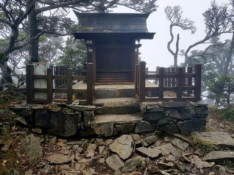 Although our vision is limited by the increasingly dense fog, this is a very enjoyable hike, with fewer steep sections — it is, after all, only 100 meters or so higher than the lodge — and more areas where the path is visible for a long distance. When we reach the peak two us move on to the shinto shrine, located about 100 meters beyond.