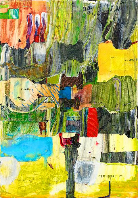 Lin Yi-wei (林奕維) is a Taiwanese painter based in Frankfurt and Kaohsiung. His solo exhibition, Hourglass (沙漏), at Gai Art features a series of paintings that correspond to 11 journal entries written in the past year. In these entries, the artist reflects on the immigrant experience, workers and homosexuals. The journals not only serve as inspiration for his paintings, they embody a continuous flow of thought that is intertwined with his daily encounters. Each entry and its corresponding painting are given the same name, and each name announces a strong narrative, such as Reciprocal Shadow: Nudity Camp at Lakeside and Pleasant to Hear the Song Played by DJ Tonight. In contrast, the paintings themselves are suggestive, ambiguous and often contain abstract use of paint. The Road to Return Home for example, depicts stripes of textured color fields stacked on each other, creating a repetitive visual order.