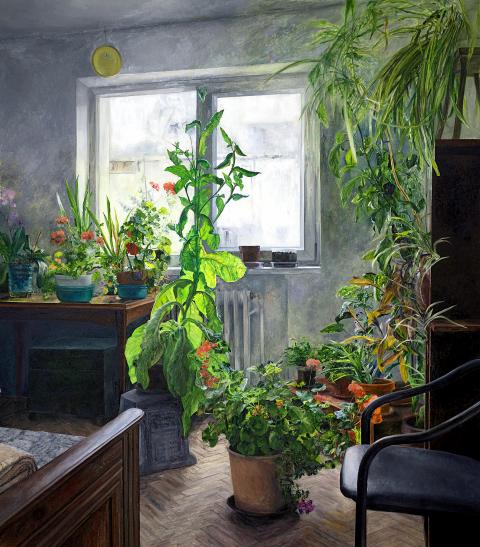 Ana Maria Micu is a Romanian artist who creates drawings, paintings and animations of herself and her surroundings. Her solo exhibition, A Picture on the Wall (牆上的圖像), at Mindset Art Center features black-and-white charcoal self-portraits juxtaposed with colorful oil paintings of her home and studio interiors. Micu is interested in story fragments; she is fascinated “with the fact that she is able to force coherence out of a broken narrative, apparently on a criterion of which she is not fully aware,” writes the gallery. In her paintings, the artist depicts cluttered interiors, drawing attention to potted plants thriving in one corner of a room, unfinished paintings taped to a wall, or bags and clothes hanging on the back of a door. “Marks of the passage of time, the endearing idealism of obsolete design, things that were left behind, abandoned or broken, are the details that the artist notices, allowing herself to be changed by her observations as she paints.”