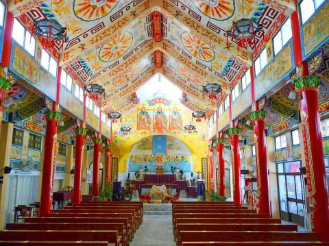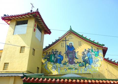 Holy Trinity Catholic Church (鹽水天主堂) is at 19 Simen Road, close to where you can catch a bus from Yanshui to Budai (布袋) via Yijhu, or to the railway station at Sinying (新營). The pale yellow walls and bell tower aren’t much of a hint as to what can be seen within. However, the roof does somewhat resemble that of a local temple, and the apparel of those shown in the mural of Jesus and his followers is distinctly Chinese.