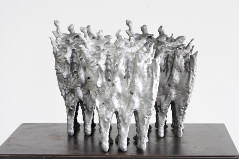 Zhan Wang (展望) is a prominent Chinese artist who creates visually captivating stainless steel sculptures and installations. Zhan is known for his metal recasts of gongshi (供石, scholar rocks), which have reflective surfaces that playfully mirror their surroundings. By reinterpreting traditional motifs with industrial material, he encourages viewers to take a different look at contemporary society and culture. Another significant body of work are his Urban Landscape (都市山水) installations, which consist of vast arrangements of domestic metal cookware laid out to resemble cityscapes. Zhan’s current solo exhibition, The Invisible (隱), features a selection of 20 works from different periods of his career, offering insights into his vast range of experiments and creative pursuits. The show includes one of Zhan’s earliest works, Mao Suit (中山裝軀殼), which consists of mannequins dressed in Mao uniforms. The show also features a new series of work entitled Forms in Flux (隱形), which involve the study of fluid dynamics with the use of 3D printing and algorithms. To create this series, forms are generated virtually before being materialized by machine. “The result is a fluid form of his granulated, morphed self,” writes the gallery in a press release.