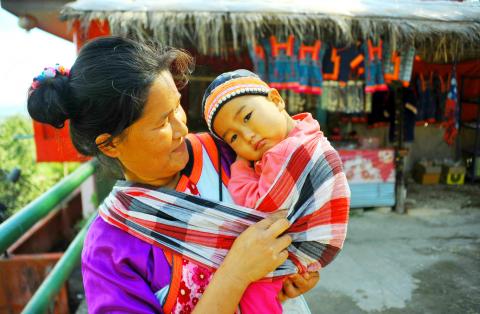 A man with a baby on his back walks up to me and starts speaking in Chinese.