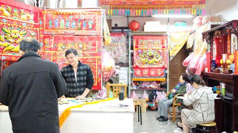 At the family-run, century-old Lien Hui Buddhist Embroidery Shop (聯暉佛具?莊), walls are festooned with tapestries depicting spectacular dragons and stern-faced deities as well as other glittery ritual accoutrements.