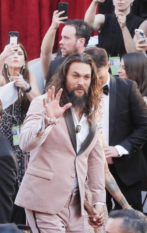 Jason Momoa wore pink Fendi, telling The Associated Press it was likely the last custom look Karl Lagerfeld designed for Fendi before he died last week.