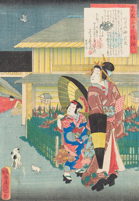 In 1998, Goino Tadashi, the honorary chairperson of the Utawa Society, donated 300 pieces of Japanese art to five institutions and universities in Taiwan. These works belonged to the style of Ukiyo-e, a 17th century Japanese art movement that literally translates to “floating road.” Ukiyo-e is a product of the Edo period, a time in which the then Japanese capital Edo enjoyed a thriving urban economy and stable political conditions. While a rising class of newly rich sought material goods to show off their social status, an influx of artists to the city cultivated a robust market for art. Ukiyo-e typically portrays narratives of female beauty, notable landscapes, dramatic characters and folk customs. The works were typically prints sold at affordable prices. Currently on view at the National Tsinghua University Museum is a selection of 40 Ukiyo-e paintings and prints donated to the National Museum of History. The Twilight Beauty by Utagawa Toyokuni III depicts a scene from The Tale of Genji, a Japanese literary classic about love affairs among the nobility. A Parade of Vassals in Kasumigaseki by Utagawa Hiroshige II is a horizontal print that shows an endless procession traversing through Tokyo’s historic government district.