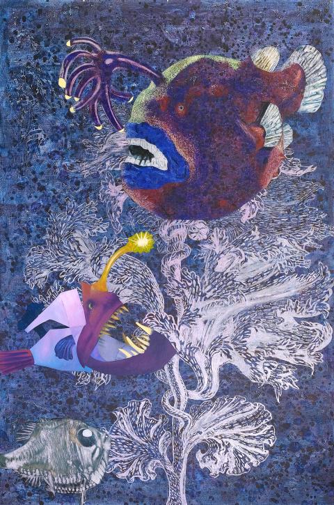 Tina Keng Gallery presents Wanderers of the Abyssal Darkness II: Somber Seas (黯黑的放浪者II:幽遊之域), a solo exhibition by Yang Mao-lin (楊茂林). Yang began creating work in the post-Martial Law era, working in painting, computer animation, installation and sculpture to examine how colonialism shapes nationalism and culture. The show marks Yang’s return to the practice of painting after an extended period of time focusing on sculpture. He has represented Taiwan twice at the Venice Biennial, showing works that express original commentary on Taiwan with playfulness and humor. Yang says Taiwan is a hybrid culture that has been under the long-term influence of Japan and the US. The metaphor of the sea is prominent in his solo exhibition of new paintings, which depict dramatic narratives of fish life amid finely articulated vegetation.