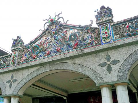 The shrine has been rebuilt and expanded several times over the centuries, but if you go through the front building you’ll come to one part that obviously hasn’t been renovated for a very long time. In Taiwan, where a great many places of worship have been made over so thoroughly they’ve lost a good part of their charm and individuality — the “no two are different” phenomenon — it’s startling to see a roof which has lost so much of its ceramic applique (剪黏) decoration.