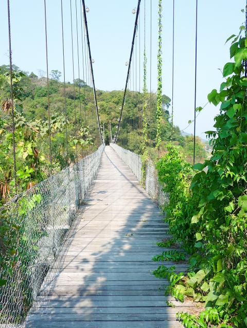 Freewheeling back down the hill, past the old camphor trees, I took the designated bike trail that leads to Yongsing Suspension Bridge (永興吊橋). This hillside trail looks over the Jhuoshuei River as it makes an abrupt 90-degree turn, but the number of freshly-fallen rocks littering the path encouraged me to push on, rather than linger and enjoy the view.