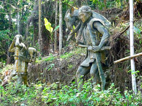 The distance was short, less than 3km, but I got a good workout. The road first plunges down to the river, where there are statues of previous village chiefs and a bridge decorated with concrete wild-boar heads. It’s then a tough grind up to a densely-arranged community which supports two churches and an elementary school.