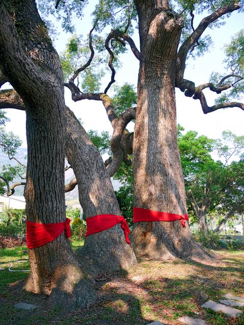 My first stop was Yongsing Giant Camphor Tree (永興神木), a 26m-tall sacred tree just past Yongsing Elementary School (永興國小). The tree is said to be more than 300 years old, and two of its descendants grow on the same site. Like sacred trees throughout Taiwan, they wear red sashes. A shrine to the land god completes a very pretty scene.