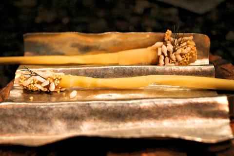 Pingtung-grown pineapples with mountain pepper mascarpone (NT$220) layer flavor and texture by cooking the fruit three ways — as fleshy rings poached in black sugar, a piquant jam and dried and crystalized slices — and balances the tricky line between sweet and tart.