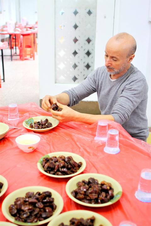 The iftar mainly draws people from low to middle-income brackets, migrant workers and exchange students. All of this makes for a strikingly international congregation, where strangers of myriad ethnicities sit shoulder-to-shoulder at the dining table.