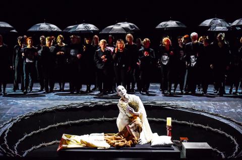 Haunting the stage are brides in white and groups of young men, while later a crowd of black-clad people of all ages wearing pictures of missing relatives, moving in silent protest against the world’s injustices.