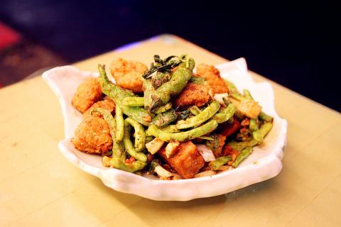 A portion of the menu is also dedicated to foods that have first been braised in lu (滷) gravy before being deep-fried — think pig’s trotters (NT$90), five-spice tofu (NT$25) and pig’s intestines stuffed with glutinous rice (NT$30).