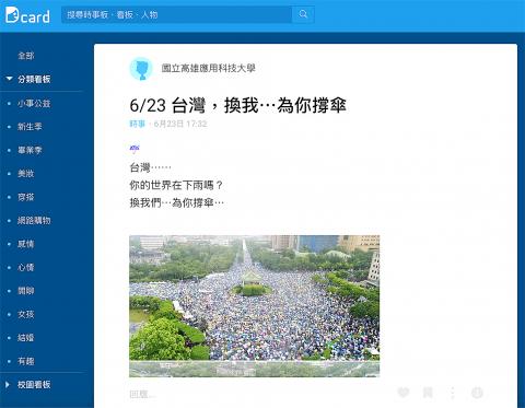 “An anonymous social media site like Dcard is a double-edged sword,” said Wu Shao-ting (吳少庭), who attended the June 23 demonstration, based on his experience as a Dcard user. “It has facilitated relatively open discussions about politics recently, but the fear that the platform may be used to manipulate public opinion remains.”