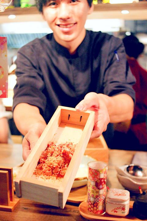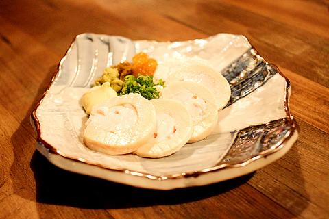 One dish with unusual texture and flavor is the chicken ham (NT$180), consisting of pale, pate-like slices of chicken served with yuzu jam, yuzu pepper, wasabi and mayonnaise. Care is taken with the ingredients, evidenced by another appetizer of cold tofu topped with katsuobushi (NT$160), or dried skipjack tuna flakes, shaved fresh tableside.