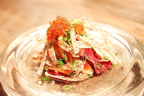 Inspiration is drawn from a range of cuisines. Skewered shrimp toast (NT$60) is an adaptation of a deep-fried Cantonese appetizer commonly found in Chinese restaurants in Japan, consisting of fresh prawn paste smeared over bread. Bone-in German sausage (NT$60) makes an appearance. Salmon is taken a step further with a topping of cured salmon roe (NT$80), echoing a seafood oyakodon, or “parent-and-child rice bowl.”