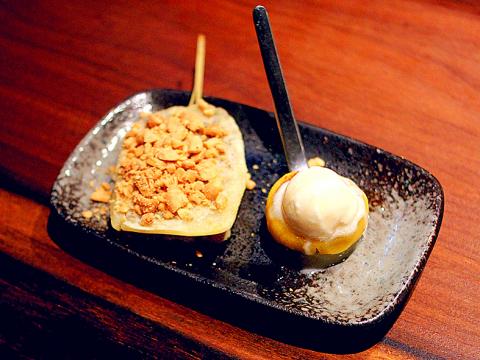 Rare for a kushiyaki joint, dessert is not an afterthought. Grilled mochi (NT$40) combines the crunchy peanuts and chewy texture that are so beloved of locals. But it’s the dessert known as “sweet thirty” (甜三十, NT$40), which plays off the temperature contrast between a dollop of milk ice cream atop a round of hot sweet potato puree, that continues the earlier streak of well-balanced and self-contained morsels.