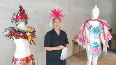 One day, someone brought in drink boxes for the artists and staff to enjoy. Recalling the MRT card holders she once made out of the cartons, Yu asked everyone to give her the boxes after they were done. Using red-and-white plastic bags as decoration, her first “recycled” samba costume was born.
