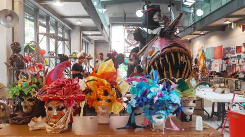 The rest of the Dream Community’s working space is right now buzzing with activity. International volunteers are helping the community’s resident artists, who have constructed impressive floats, costumes and props relating to this year’s theme.