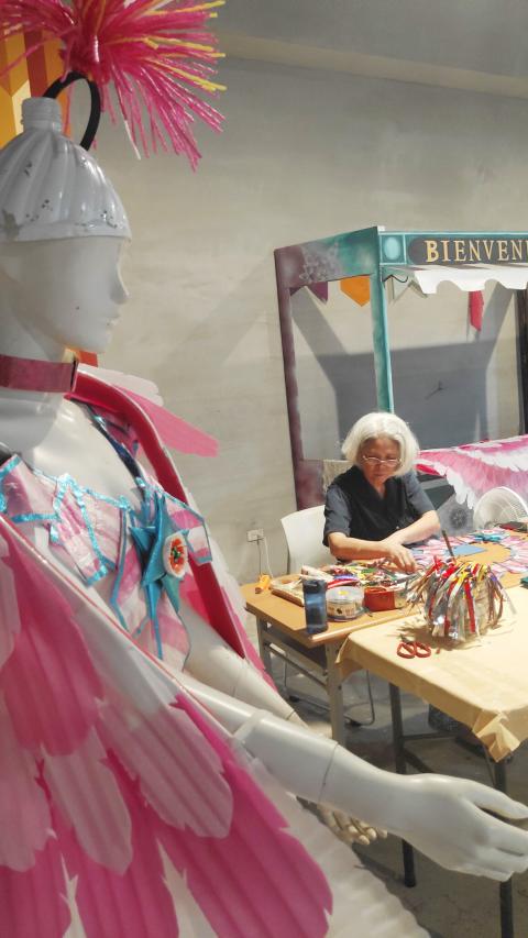 When Yu Mei-ying (余美英) was tasked with making a samba costume with chicken elements, she headed to the local fruit stand instead of the craft store. She selected pink and white Styrofoam liners for the wings, and tore up the red and yellow fruit nettings for the crests.