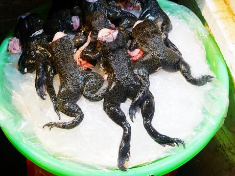 Not all of the fresh food sold in the market qualifies as seafood. I noticed the corpses of a dozen big black frogs on top of a bucket filled with ice. The vendor — the only person working in the market who spoke to me in English — told me that these amphibians are farmed in Taiwan, not taken from the wild, and that they’re best enjoyed cooked in soup with lots of onion.
