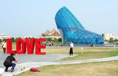 Wanting to walk off our lunch, we made our way to one of the region’s more unusual sights. The High-Heel Wedding Church (高跟鞋教堂) is the centerpiece of a park bordered by Wenchang Street (文昌街) and Haixing Street (海興街), about 800m southwest of the fish market. Strictly speaking, it isn’t a house of worship, although weddings are sometimes held beneath its translucent blue roof.