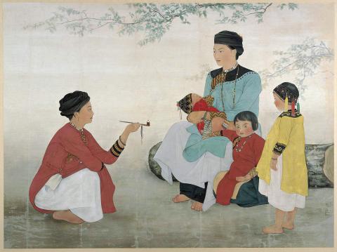 In 1934, Chen returned home to teach art at Pingtung Girls High School, becoming Taiwan’s first female high school teacher. She often visited the Paiwan Aborigines in the Sandimen area, resulting in her well-known Women of Sandimen (三地門之女).