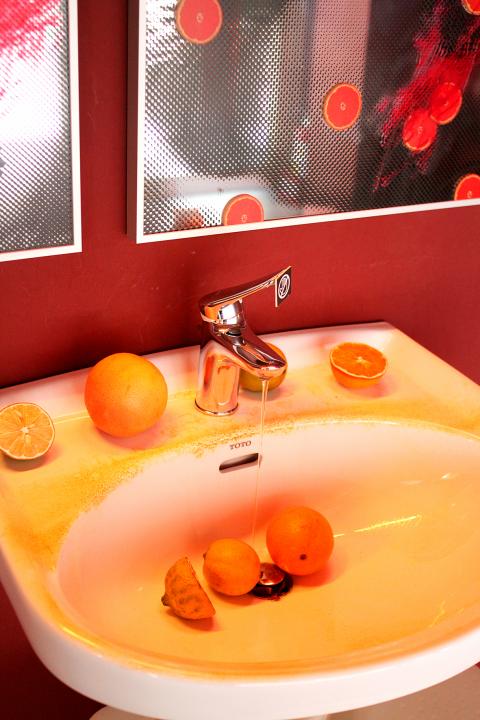 Next to the ATM, the bathroom set-up in Lo Chih-hsin’s (羅智信) Like a filter, matters passed through you and became a part of you. (Twilight) (像是顆濾心,物質穿越過你便成為你的一部份(暮光之城)) is a tongue-in-cheek commentary on our fascination with blood and hygiene through contemporary vampire romance novels.